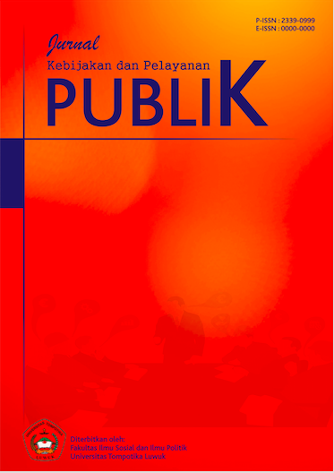 Vol. 8 No. 1 (2020)Jurnal Kebijakan dan Pelayanan Publik merupakan media publikasi ilmiah yang diterbitkan oleh Fakultas Ilmu Sosial & Ilmu Politik Universitas Tompotika Luwuk, menyajikan hasil karya ilmiah sesuai disiplin ilmu yang meliputi Ilmu Pemerintahan, Ilmu Politik, Ilmu Administrasi Negara/Publik, Ilmu komunikasi dan ilmu-ilmu sosial lainnya yang mempunyai relevansi keilmuan sosial politik, sehingga ruang lingkup penelitian lebih bersifat universal, objektif, empiris disesuaikan dengan dinamika dan fakta permasalahan.
